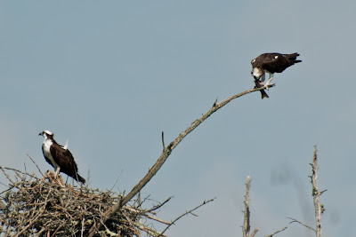 A friend called to tell me that the Osprey couple were still in the area, and were building a new nest. It appears that this one comes with a build in Dining Room. I think it is too late in the season now for them to have another nesting..... given that it takes 35-40 days for eggs to hatch, then another 6 weeks before the young birds can fledge the nest. However it is great that they are still here, and should return next year.